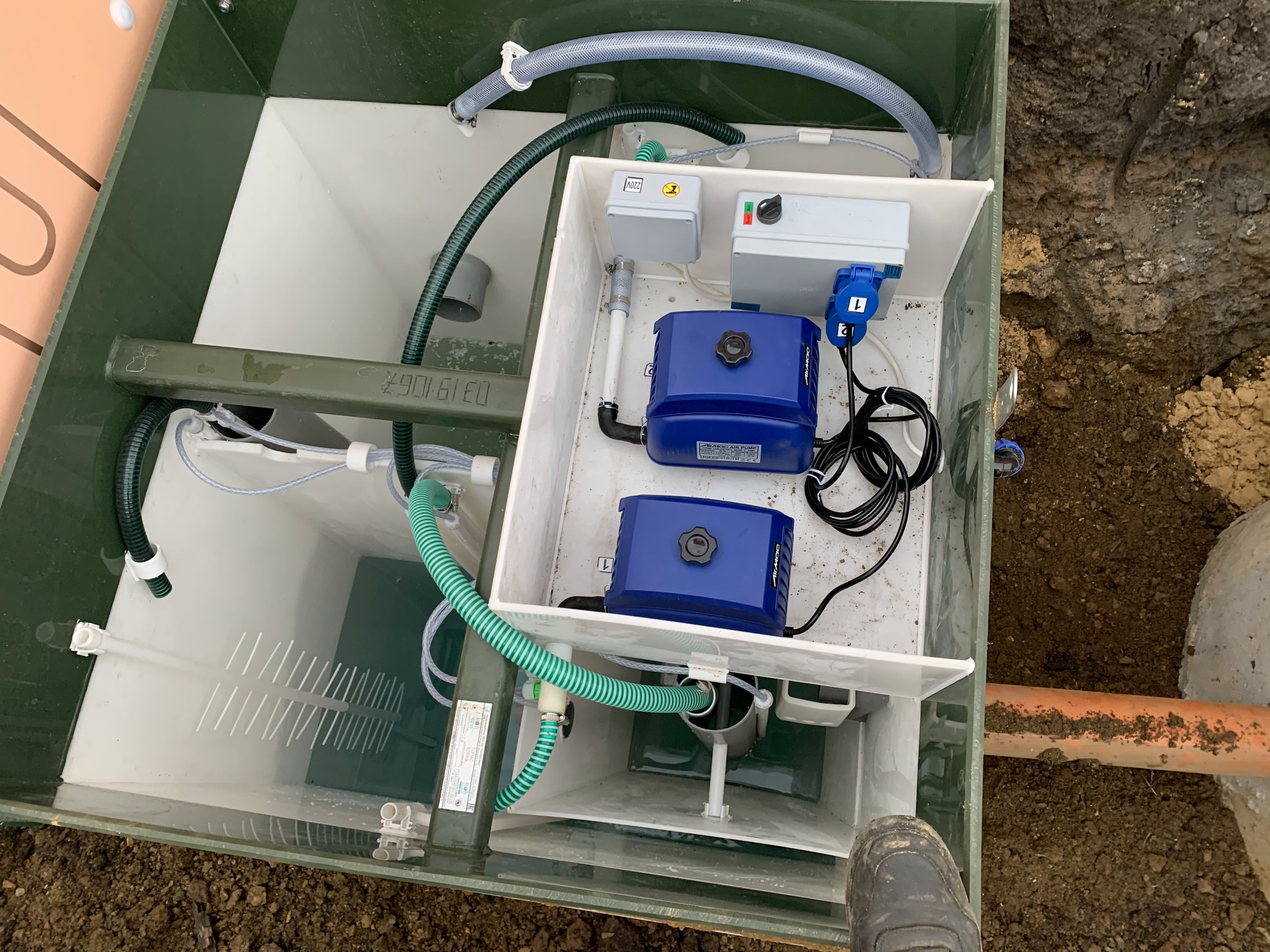 Станция биологической очистки также представляет собой емкость, разделенную на секции. И дополнительно там установлен компрессор или насос для аэрации стоков и более высокой степени очистки - до 98 %. Стоки после станции так же направляются в дренажный колодец, но также могут сбрасываться в грунт или канаву.